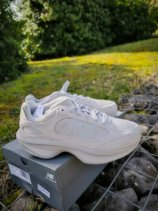 Zapatillas de la marca New Balance en tonos beige y gris. Diseño moderno y cómodo. - Parte superior de ante y malla. - Detalle del logo 'N' en el lateral. - Suela de goma para mayor tracción.