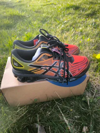 Zapatillas Asics - Combinación de colores naranja y negro. - Detalle de líneas en la parte superior. - Logo de Asics en los laterales.