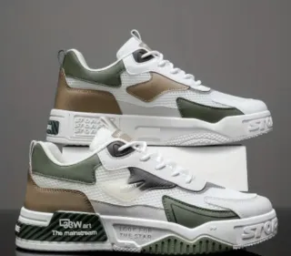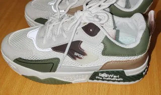 Zapatillas con un diseño moderno y detalles llamativos. - Combinación de colores blanco, verde y marrón. - Materiales textiles y sintéticos. - Suela gruesa con diseño. - Cierre de cordones.