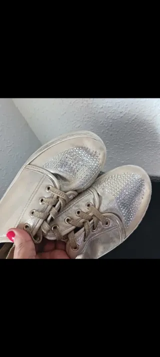 Zapatillas de mujer con un diseño brillante y llamativo. - Detalle de pedrería en la puntera. - Cordones a tono.