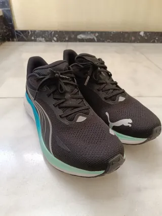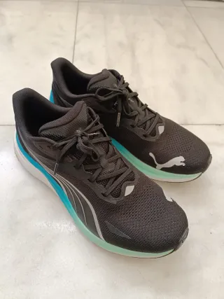 Zapatillas deportivas Puma Nitro con un diseño moderno y llamativo. - Combinación de colores negro y turquesa. - Detalle de franjas laterales. - Logo de Puma en el lateral.