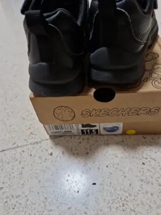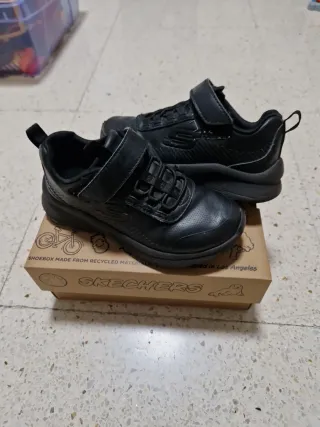 Zapatillas infantiles de la marca Skechers en color negro. Cuentan con cierre de velcro para un ajuste fácil. - Diseño deportivo. - Suela de goma. - Fabricadas con materiales reciclados. Talla 28