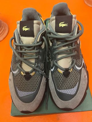 Zapatillas de la marca Lacoste en tonos beige y verde. - Diseño moderno y deportivo. - Combinación de materiales. - Cierre con cordones.