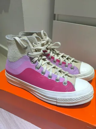 zapatilla es la Converse Chuck 70 Hi Thermo Felt, una edición especial Su diseño destaca por el uso de fieltro térmico en capas onduladas que evocan las ondas de una tormenta "nor'easter". Color: Blanco invierno / Rosa lavanda (Winter White / Pink Lavender). Materiales: Presenta una parte superior de lona con superposiciones de fieltro térmico troquelado en capas, lo que le da su textura distintiva y ondulada. Suela: Suela de caucho ligeramente amarillenta con una plantilla transpirable para mayor comodidad.#converse#zapatillas#botin#edicionesoecial