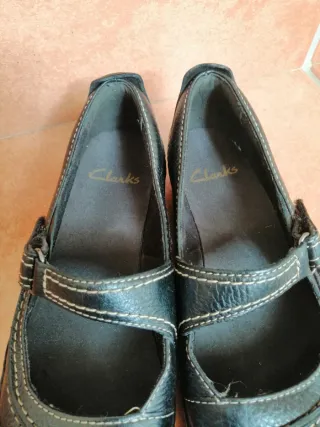 Zapatos Clarks negros para mujer, con un diseño elegante y cómodo. - Material exterior de piel. - Cierre de hebilla. - Costuras decorativas.