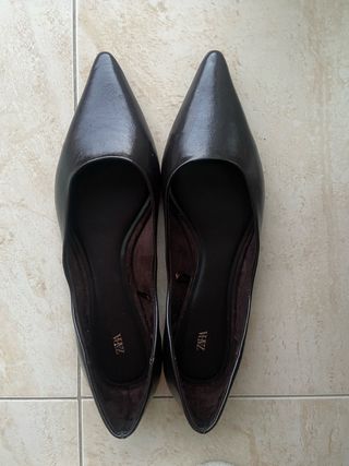 Elegantísimos zapatos de piel de tacón alto, marca Zara Woman Tienen veinte años Con detalle de prespuntes Discreto adorno metálico en color plata Usados pocas veces. Uno de los zapatos tiene rozadura en un lateral y aún así no desmerece nada lo preciosos que son