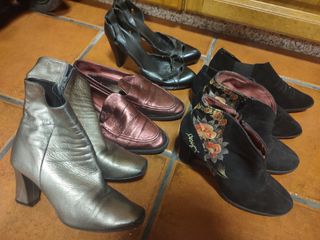 Lote de zapatos variados para mujer. Diferentes marcas del corte inglés, talla 39/40 - Botines plateados con tacón. - Zapatos planos color cobre. - Botines negros con estampado floral. - Zapatos negros de vestir.