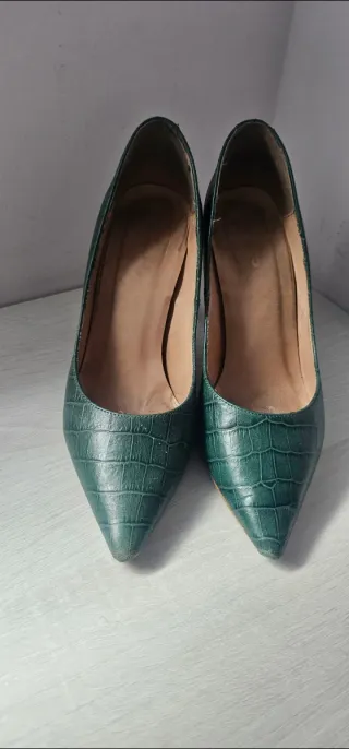 Elegantes zapatos de tacón Fosco en un llamativo color verde. Perfectos para añadir un toque de estilo a cualquier atuendo. - Destacar marcas de uso en las punteras ver últimas fotos. - Diseño de punta fina. - Acabado texturizado tipo cocodrilo. - Tacón de aguja.