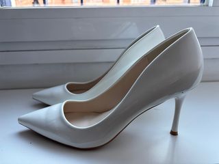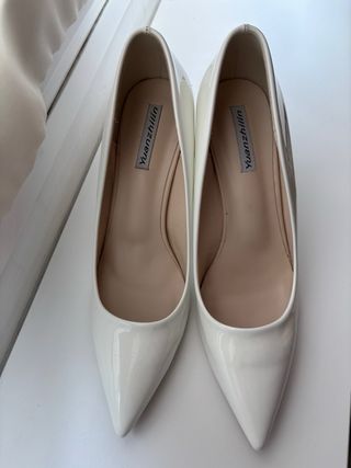 Zapatos de novia blanco Charol tacón 9 - Acabado brillante. - Detalle de hebilla dorada. Solo puesto para la foto luego guardados, pero los puedes llevar con vaqueros también. Quedan muy bonitas. Descuento por pack