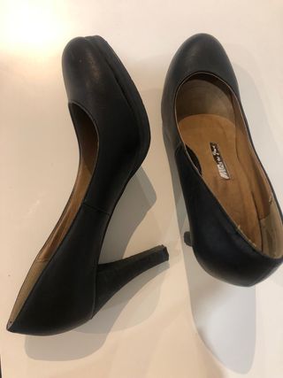 Zapato negro tacon. Uno de ellos ha saltado un poco el material de la plataforma de delante, pero solo tiene dos puestas.