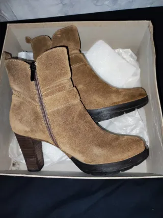 Botines de tacón con acabado en ante. - Tacón grueso de madera. - Cierre de cremallera lateral. - Detalle de tira en el tobillo. Nuevo ! Oferta