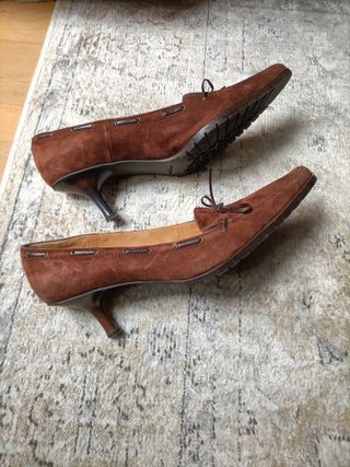 Elegantes zapatos de ante en color marrón. - Tacón fino y estilizado. - Detalle de cordones en la pala. - Punta fina.
