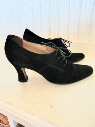Elegantes zapatos vintage Balenciaga Paris, confeccionados en nubuck negro de alta calidad. Un diseño clásico y atemporal con cordones y tacón fino, que refleja la sofisticación parisina y el saber hacer de una etapa icónica de la maison Balenciaga. Este par, distribuido en su día por El Corte Inglés, pertenece a una época anterior de la firma, lo que lo convierte en una auténtica pieza vintage de diseñador, ideal para coleccionistas y amantes de la moda elegante y duradera. Su silueta estilizada aporta un toque distinguido tanto a looks formales como a conjuntos más contemporáneos con inspiración retro.