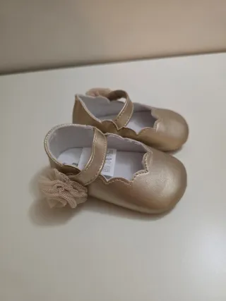 Preciosos zapatos para bebé en tono dorado, perfectos para ocasiones especiales. - Cierre de velcro. - Detalle de corazón en la tira. - Acabado brillante.
