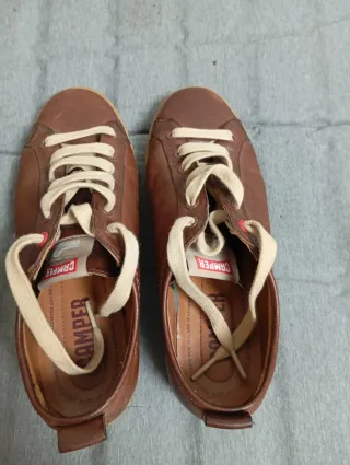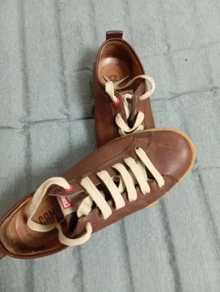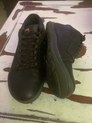 Botas estilo Camper para hombre, con un diseño moderno y versátil. Son muy cómodas, lo más cómodo que he probado, pero son de hombre. - Material de cuero. - Cierre con cordones. - La suela, está normal, están andadas un tiempo las botas, sino no sería ese precio, son Camper, es marca de alta calidad y resistente, son botas, como nuevas, por dentro se puede apreciar, y toda la piel del zapato está como nueva.