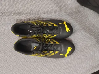 Zapatos de fútbol Puma en colores negro y amarillo. Ideales para jugar en el campo. - Diseño deportivo con detalles llamativos. - Cierre con cordones para un ajuste seguro.
