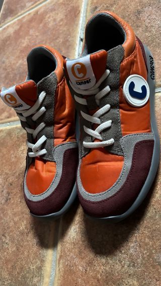 Zapatos de la marca Camper para niños, con un diseño moderno y cómodo. - Combinación de colores naranja y marrón. - Cierre con cordones. - Detalle de logo en el lateral.