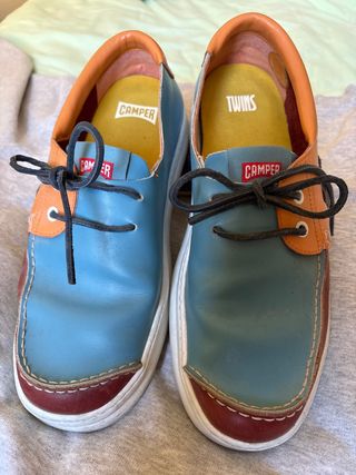 Nauticos de la marca Camper, modelo Twins. - Combinación de colores azul y naranja. - Detalle de costuras. - Cordones negros. - Suela blanca.