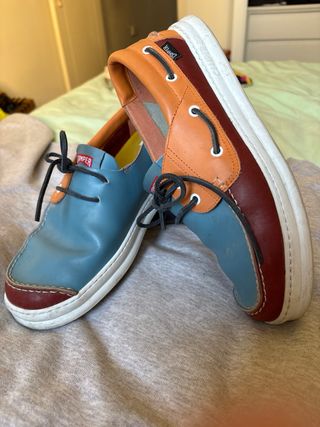 Zapatos de la marca Camper, modelo de 2017 aproximadamente. Usados muy pocas veces porque me molestaba el cierre trasero (tengo espolón grande). Suela muy cómoda arqueada y tela de chubasquero. Interior y plantillas originales en buen estado.