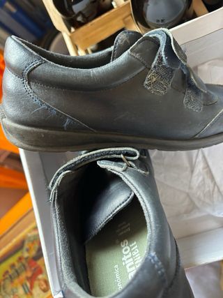 Zapatos de piel T.39 negros colegial. Cierre en velcro. Lo han dado todo, la suela desgastada en la parte del tacón parte izquierda en zapato izquierdo, y parte derecha en zapatos derecho. Serían buenos para una transición del 39 al 40 y no quieras gastarte dinero en unos nuevos del 39.