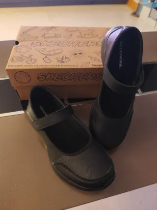 Merceditas negras de Skechers para niña, perfectas para el colegio. - Super ligeras y comodas - Cierre de velcro. - Parte superior sintética / textil - Suela flexible. - Lavables a maquina SIN USO
