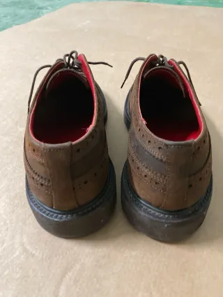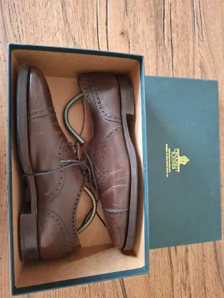 Zapatos Oxford full brogue, modelo Clifford, cuero marrón medio con una impresionante pátina, horma 337. Línea Hand Grade de la marca Crockett & Jones, la más cara y exclusiva fabricada para competir con Edward Green y John Lobb. Modelo mítico actualmente descatalogado, PVP del modelo Belgrave que lo ha sustituido: 870€. Zapatos usados en muy buen estado, destacar únicamente un mínimo desgarro en el forro interno del talón de uno de los zapatos que no se ve con él puesto. Talla 9,5E, mas o menos equivalente a una 43,5 española / 10,5 americana. La venta incluye sólo los zapatos, no tengo caja ni bolsas.