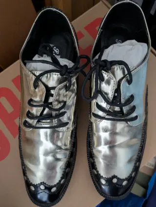 Elegantes zapatos de estilo Oxford con un acabado brillante. - Diseño de cordones. - Detalle de picado en la puntera. - Suela negra. Ideal para bailes, disfraz (futurista, robot, hombre se hojalata del mago de oz,...) o para destacar. Prácticamente nuevos.