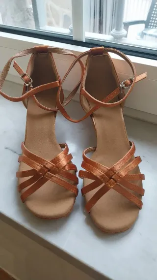 Elegantes zapatos de baile color cobre con un acabado satinado. Talla 38 - Diseño abierto con tiras sujeta a la suela.