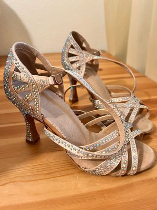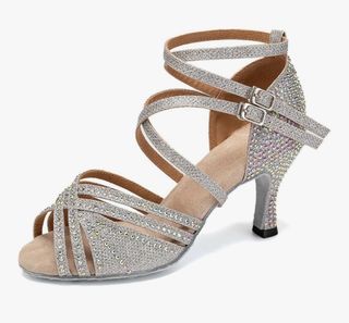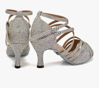 Elegantes zapatos de baile latino con un diseño brillante. - Tiras cruzadas adornadas con pedrería. - Cierre de hebilla. - Suela de ante.