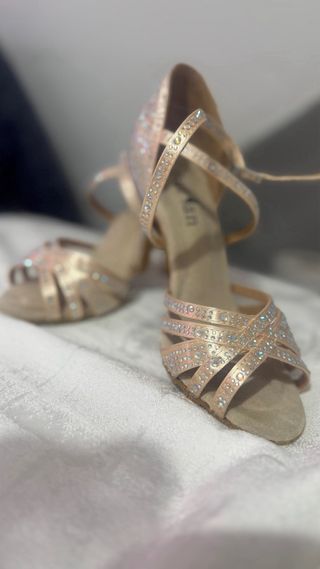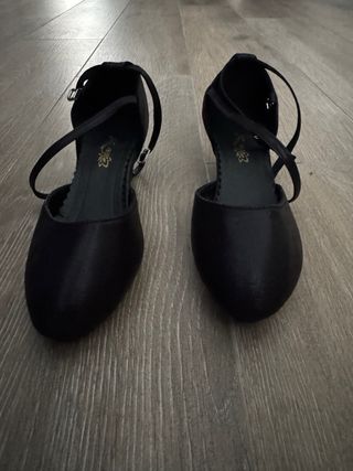 Zapatos de salón para baile, talla 33. Están en perfecto estado, como nuevos. Pedí talla 39, pero me llegaron estos en 33. Por eso están completamente nuevos. De propia experiencia con los que sí llegaron en mi talla, son zapatos muy cómodos para los bailes de salón. - Tacón bajo y cómodo, 3.5 cm - Cierre de hebilla - Sirven también para bailar fuera porque tienen suelo de goma y no de ante.