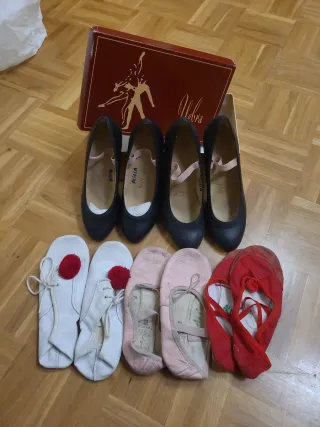 Lote de zapatos de baile y zapatillas de ballet para niña. - Zapatos de baile negros con tira elástica.33 y 36 suela nueva - Zapatillas de ballet blancas34 con cordones y pompón rojo. - Zapatillas de ballet rosas con cordones.34 - Zapatillas de ballet rojas con tiras cruzadas.35 El precio es por cada par de zapatos negros Las zapatillas las regaló