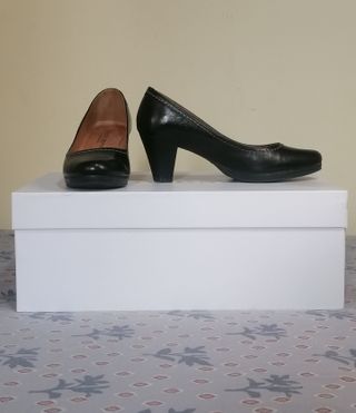 Elegantes zapatos negros de tacón. - Marca: Pasos de Baile. - Material satinado.