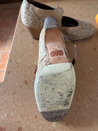 Zapatos de baile numero 37 color champan. Practicamente nuevos, usados en 4 ocasiones. Uno de los cordones esta un poco descosido.