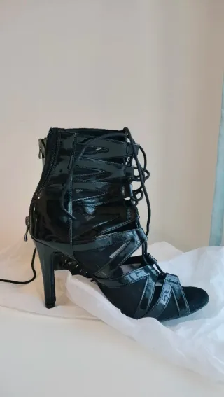 Elegantes zapatos de baile con tacón alto y diseño de tiras. - Acabado brillante. - Cierre con cordones y cremallera trasera. - Diseño abierto en punta y talón. - Tacon de 10cm - los he usado 4 veces y los vendo porque noto que me van algo grandes, pero son super cómodos. Me los regalaron para reyes de este año.