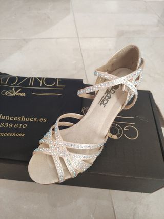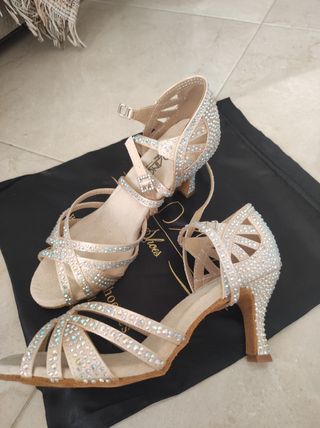 Sandalias de tacón para baile latino. Completamente nuevos , sin ningún uso. Sandalia color champagne con agarre cruzado en el empeine y decoración con cristales. Tienen suela de serraje y planta de gel para una mayor comodidad. Incluye bolsa de transporte. Hechos a mano, fabricados en España. Precio original 130€