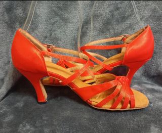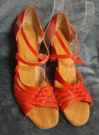 Zapatos de baile con punta abierta, tiras entrelazadas, color naranja, mujer. Material satén, agarre con tiras cruzadas por el empeine. Pone n°38.5 Pedro se corresponde más a un n°39 (largo de pie 26 cm. Ancho 8 cm.) Suela serraje. Tacón 8.5 cm. Nuevo, sin estrenar. Tiene unas manchitas en un zapato zona del talón (foto 4-5) por el roce. Ideal para fiestas, bailes latinos, bailes de salón, bodas, baile social. Modelo original. TENGO MÁS MODELOS Y NÚMEROS EN MI PERFIL. ENVIO INMEDIATO! #zapatodebaile #zapatosnaranja39 #sandaliasmujer #zapatostiras #zapatosmujer #zapatosdebailetiras #zapatosdebailemujer #chaussuresdedanse