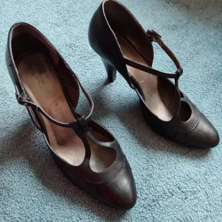 Elegantes zapatos de tacón para mujer, elaborados en piel. Cierto estilo vintage. - Color negro - Como nuevos, se han usado en 4 ocasiones, ver fotos de la suela y de las punteras para comprobar su buen estado. - Tipo salón o baile. - Abiertos por los laterales. - Diseño con tira en T y cierre de hebilla tipo pulsera. - Tacón de 9cm. - Acabado mate.