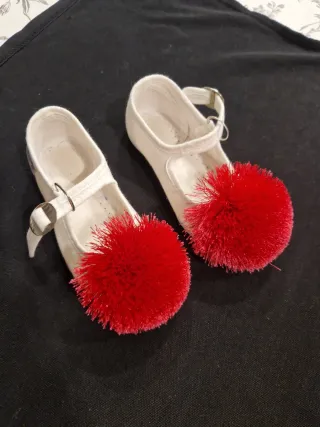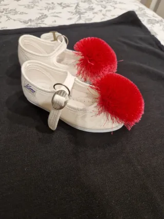 Bonitas manoletinas blancas adornadas con un llamativo pompón rojo. - Cierre de hebilla. - Detalle de pompón en la puntera utilizadas para fallera bebe en carro talla 22