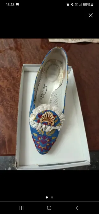 Traje de fallera con un diseño elegante y tradicional. - Tejido brocado en tonos azul y dorado. - Cuello de encaje con detalle de lazo. - Mangas con volantes de encaje blanco. -zapatos talla 39/40 -espardeñas 39/40