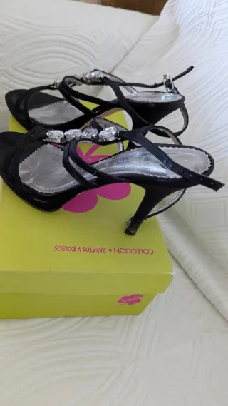 Elegantes zapatos de tacón con un diseño brillante, perfectos para ocasiones especiales. Están nuevos, a estreno. Viene con su caja original. Hago envíos rápidos y protejo bien el paquete. Echa un ojo a mi perfil para más variedad. - Acabado con pedrería. - Tira ajustable al tobillo. - Tacón alto. - Punta abierta. REF N1-38