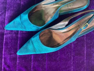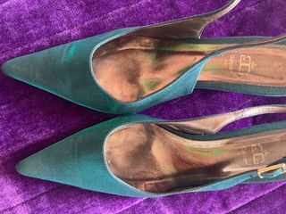 Zapatos de fiesta color azulado o verdoso (dependiendo de la luz) descubiertos por detrás cerrándose con una hebilla, número 40