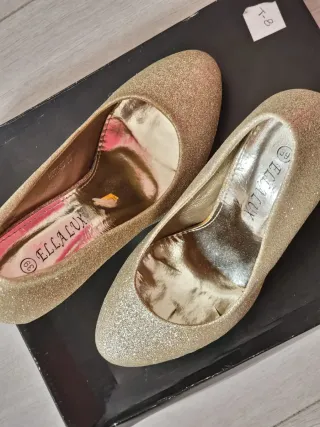 Preciosos zapatos de fiesta, tacón al aire, en color beige. Ideales para una ocasión especial. - Son de tacón bajo. N°37. Zapatos cerrado de fiesta. N°37. Zapatos de fiesta dorado N° 37. Ideal para este verano, fiestas, comuniones etc. A 20€ cada uno, puestos una vez. - Tienen un diseño elegante y sofisticado. - Están en perfecto estado. Cada uno de los modelos 20€.