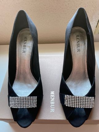 Tacones de salón negros de tela brillante, 9cm de tacón y plataforma interna en la parte delantera. Cerrados con la puntera abierta......... Muy cómodos, buena horma y la plantilla de piel . Menbur es una marca de zapatos de vestir bastante cara. Son muy elegantes y quedan muy bonitos pero a mi me van justos y nunca me los pongo. Dos usos. Sin caja.