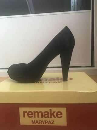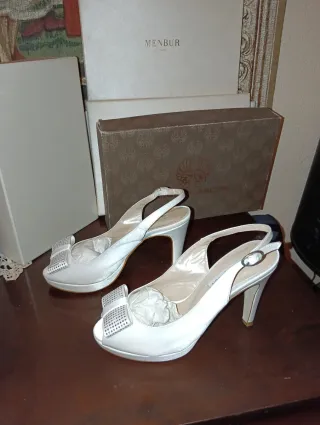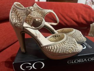 Elegantes zapatos, hechos a mano en Madrid, de tacón para ocasiones especiales. Solo puestas en dos celebraciones. La suela y el zapato de dentro se ven usados pero la piel está perfecta, sin roces. - Diseño abierto en la punta. - Tira fina en el tobillo con hebilla. - Plataforma delantera. - Tacón grueso y estable.