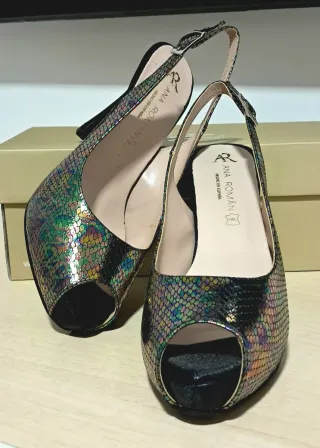 Elegantes zapatos de fiesta con plataforma y tacón de la marca Ana Roman. - Diseño peep-toe. - Acabado con efecto escamas. - Tira ajustable al talón. - Piel natural. - Hecho en España. Liquidación zapatería Piel.