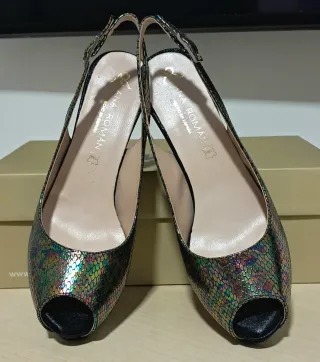 Elegantes zapatos con plataforma y diseño peep-toe, ideales para bodas, eventos y ocasiones especiales. El detalle abierto en la puntera aporta un toque femenino y sofisticado, mientras la plataforma estiliza la figura y ofrece mayor comodidad al caminar. Perfectos para completar un look de invitada o ceremonia combinando estilo y confort. 🧵 Hechos en España, excelente calidad en materiales y acabados. 🏷️ Procedente de tienda – Precio original 159€. 📦 Estado: Nuevo. Una opción premium a precio mucho más competitivo que en boutique. - Tira ajustable en el talón.