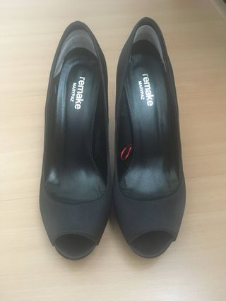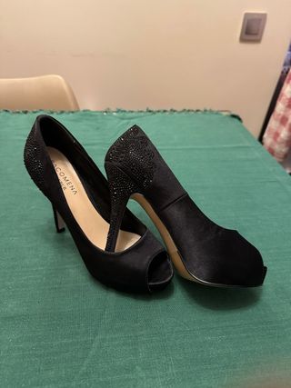 Elegantes zapatos de tacón para ocasiones especiales. Usados en una ocasión. - De raso negros. - Tacón alto y plataforma. - Con tapas de recambio. - Diseño sofisticado.