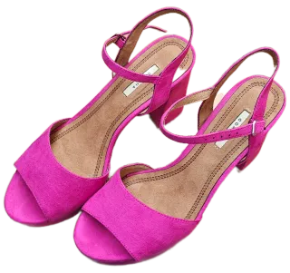 Elegantes zapatos de tacón alto en color fucsia, perfectos para ocasiones especiales. Cuentan con un diseño llamativo y detalles brillantes. - Tiras finas en la parte superior. - Adorno de flecos con pedrería en la puntera. - Plataforma delantera. - Tacón grueso.