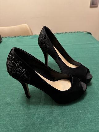 Elegantes tacones negros, perfectos para eventos especiales como bodas o fiestas. Diseñados con un detalle de lazo en la punta y una plataforma discreta. - Material textil. - Tacón alto.