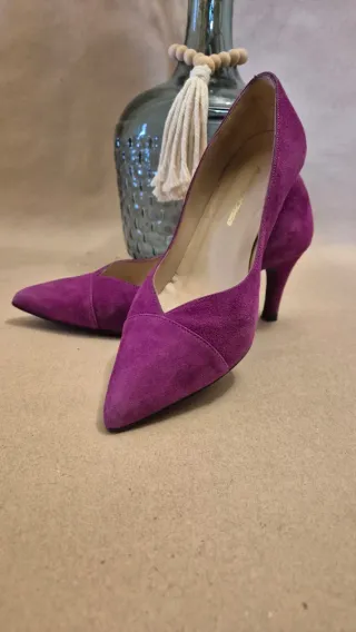 Elegantes zapatos de tacón con un vibrante color morado, perfectos para eventos especiales. - Diseño de punta fina. - Material de ante. - Tacón de altura media.6cm. - Marca Ana Lacasa. Valencia. - Usados 1 vez.
